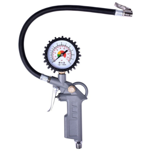 Calibrador e inflador de ABS, enche ou esvazia sem mover o conector do bico, ergonômico e fácil de usar. Possui manômetro que lê: 0 - 220 PSI, 0 - 15 Kg/cm² e 0 - 150 kPa., indicador de pressão de 50 mm, 1/4 NPT 7 BAR, mangueira prolongadora flexível de 33 cm (13"), rosca macho de 1/4" BSP (Padrão Britânico). Corpo de metal com proteção de borracha anti queda em volta do indicador de pressão; bico prendedor para fácil operação; gatilho para inflar e botão para alívio de pressão; insuflador de alta qualidade; clip de fixação de ângulo único; fornece pressão precisa com uma rápida e fácil pressão do polegar; mandril de pneu de alta qualidade de zinco com clip de aço.