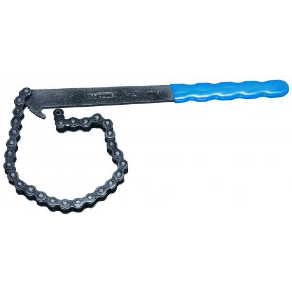 Corpo e corrente em aço especial, empunhadura plasticada na cor azul padrão Gedore. Acabamento escurecido. Indicada para utilização em tubulações e filtro de óleo.
