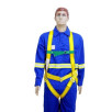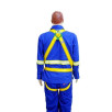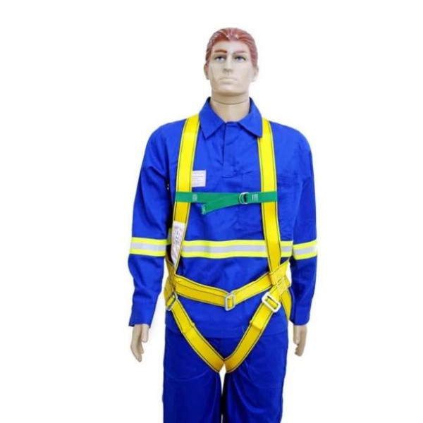 Cinturão de segurança tipo paraquedista confeccionado em fita poliéster, com um ponto de ancoragem dorsal em meia argola em "D" em aço forjado, posicionada nas costas na altura dos ombros, regulável ao cinto através de um passante plástico.