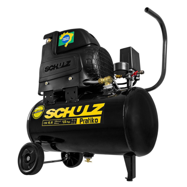 Projetado e fabricado pela Schulz no Brasil, o compressor portátil Pratiko CSI 6,6/20 oferece mais possibilidades para suas atividades profissionais. Indicado para serviços leves e pequenas manutenções, o Pratiko CSI 6,6/20 é excelente para pinturas em geral com pistola de pintura de baixa produção*, limpeza de peças e superfícies com pistola e bico de ar, acionamento de pequenas ferramentas pneumáticas, pulverização de óleo para lubrificação de máquinas e equipamentos, calibragem de pneus e enchimento de objetos infláveis, como bolas, boias, botes e colchões. A praticidade faz parte de todos os detalhes do compressor, que possui suporte exclusivo para enrolar o cabo elétrico, reservatório certificado, motor com relé térmico, botão liga e desliga no pressostato e carenagem que melhora seu desempenho e protege do contato direto com as partes quentes do produto. Leve, compacto e com alça de transporte, o Pratiko CSI 6,6/20 tem a tecnologia, qualidade e tradição Schulz, que ainda oferece a maior rede de assistência técnica do Brasil.