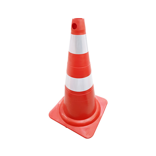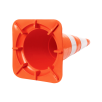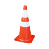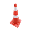 Cone em PVC na cor laranja. Para uma melhor sustentação possui 8 sapatas (pés de apoio) em sua base. Possui duas faixas refletivas na cor branca. As faixas são confeccionadas em PVC micro prismático.