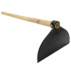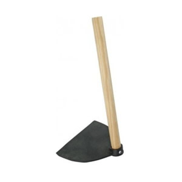 Enxada fabricada em material composto de plástico ( PVC ), com cabo de madeira.