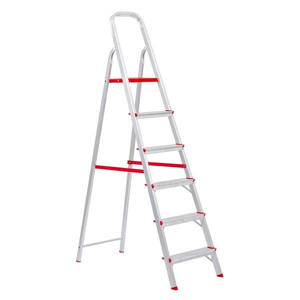 A escada Prima é ideal para uso doméstico. É produzida em 100% alumínio de liga especial que proporciona qualidade e durabilidade. Possui 6 degraus e pés antiderrapantes para evitar que escorregue na hora do uso, garantindo maior segurança, travamento automático no patamar, corrimão alto, seguro e super resistente.
