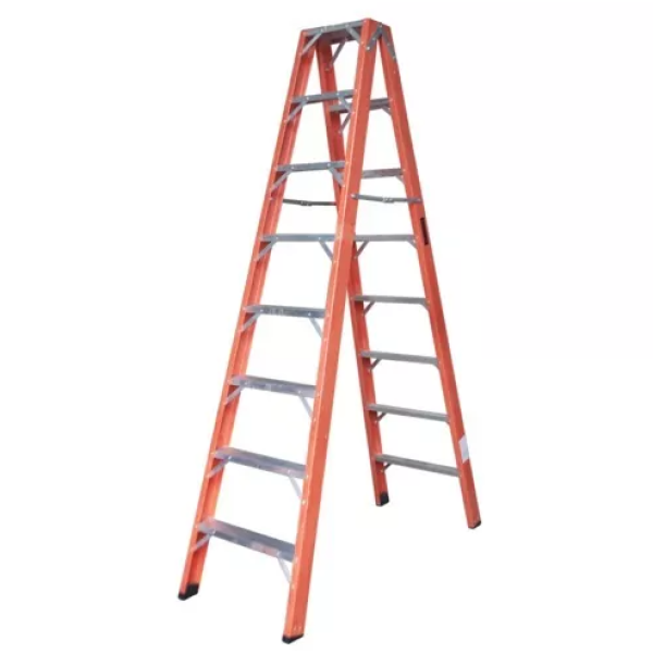 A Escada de Fibra modelo americana dupla 8 degraus possui estrutura em fibra de vidro e degraus em alumínio, é prática, leve e resistente, indicada para uso profissional ideal para uso na pintura de paredes.