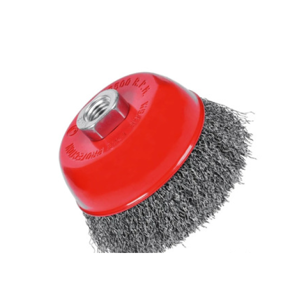 Escova circular de aço carbono temperado, tipo copo, com tufos de filamentos ondulados, fio de 0,5 mm de espessura, encaixe da rosca M14, para remoção de ferrugem, solda, rebarba, tinta, etc, proporciona maior rendimento