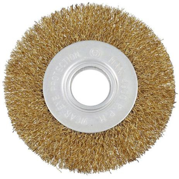 Escova de aço com cerdas flexíveis para limpeza de peças, remoção de ferrugens, vernizes e crostas de soldas sem danificar a peça obra.