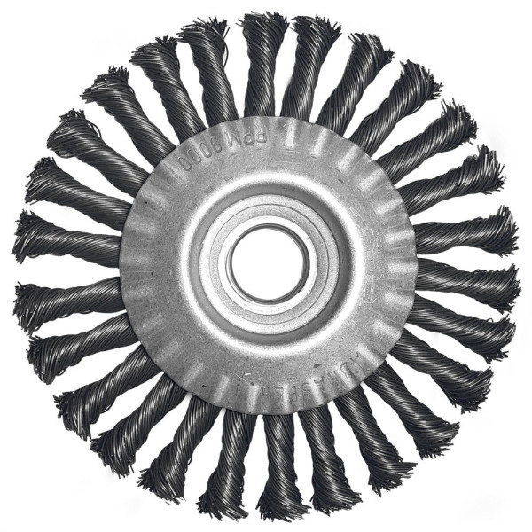 Escova circular trançada fabricada em aço carbono proporcionando resistência e eficiência, ideal para trabalhos mais pesados de limpeza ou remoção de carepas.