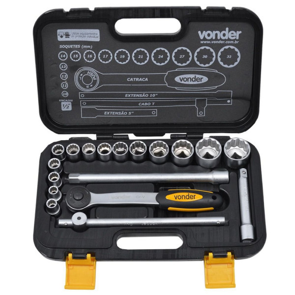 14 soquetes estriados (10 mm, 11 mm, 12 mm, 13 mm, 14 mm, 15 mm, 16 mm, 17 mm, 19 mm, 21 mm, 24 mm, 27 mm, 30 mm e 32 mm), 1 catraca reversível, 1 cabo T, 1 extensão 5" e 1 extensão 10"