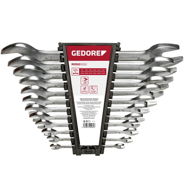 O Jogo de Chave Fixa da Gedore Red, marca conceituada no ramo das ferramentas, é composto por 8 peças, cujas medidas variam entre 6-32mm e acompanham um suporte especial, fabricadas em aço cromo vanádio, com acabamento cromado fosco, conforme as normas DIN 895.