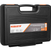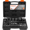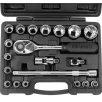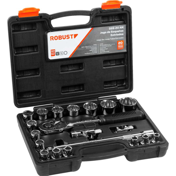 1 Jogo de soquetes, composto por 20 peças, sendo: 16 soquetes estriados (8,0 mm; 9,0 mm; 10,0 mm; 11,0 mm; 12,0 mm; 13,0 mm; 14,0; mm; 15,0 mm; 17,0 mm; 19,0 mm; 21,0 mm; 22,0 mm; 24,0 mm; 27,0 mm; 30,0 mm e 32,0 mm), 1 adaptador para cabo T, 1 extensão de 250,0 mm, 1 junta universal, 1 catraca reversível com empunhadura emborrachada.