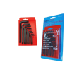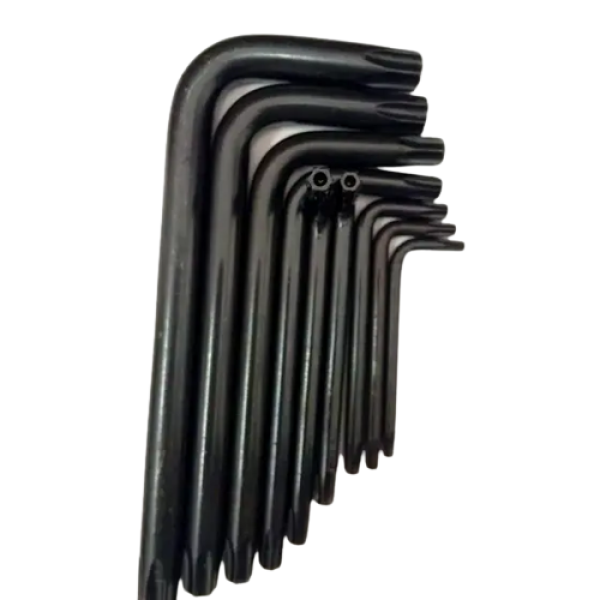 Jogo de Chave Torx Estrela (com furo) Preto contendo 9 peças do T10 ao T50. Cromo vanadio niquelado, resistente a impactos manuais e a oxidação, haste em L e braço curto e longo, para flexibilizar e facilitar a operação. Material: Aço carbono temperado fosfatado.