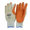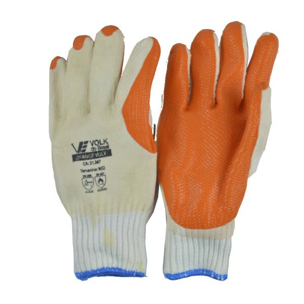 A Luva Tricotada Laranja Tamanho G - Volk tricotada em fios de algodão; revestida em látex natural, borracha vulcanizada antiderrapante na palma, face palmar e ponta dos dedos, acabamento rugoso, punho tricotado com elastano.