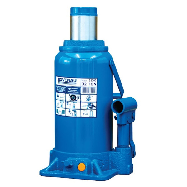 Macaco hidráulico tipo garrafa fabricado CJ32 em estrutura resistente, utilizado para elevação de veículos. Equipado com válvula de sobrecarga que impede o usuário de elevar cargas maiores que a capacidade nominal do macaco