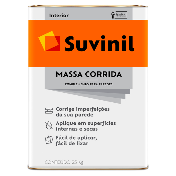 Suvinil Massa Corrida preenche as imperfeições para que a superfície fique lisa e branca, pronta para receber a tinta. Ela também é fácil de aplicar e lixar, otimizando o seu tempo!