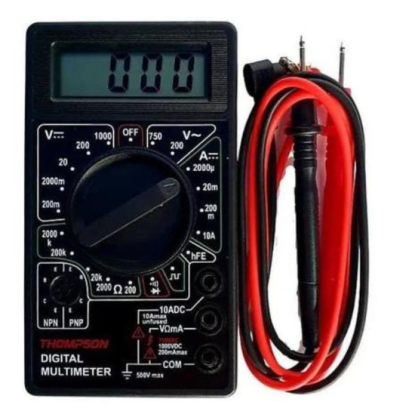O multímetro digital Thompson, mede com precisão grandezas de componentes eletrônicos, tem como funções básicas medidas de tensão AC e DC, corrente DC, resistência e teste de diodo. Acompanha um par de pontas de prova, e uma bateria 9V.